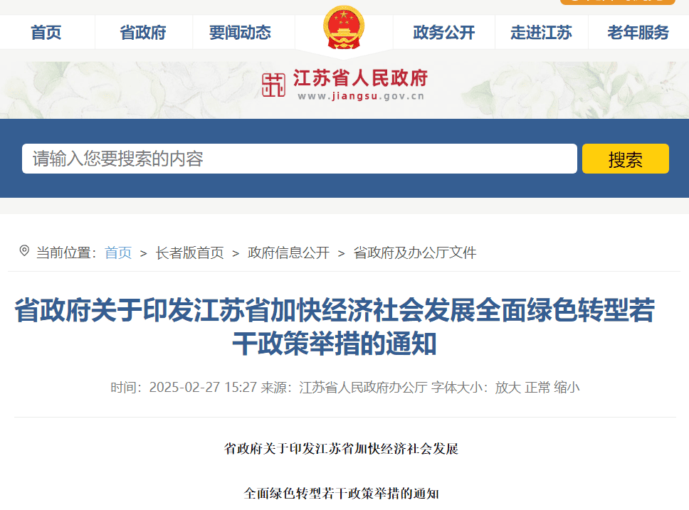 2月15日,江蘇省人民政府印發了《江蘇省加快經濟社會發展全面綠色轉型若干政策舉措》的通知(以下簡稱:綠色轉型舉措)。