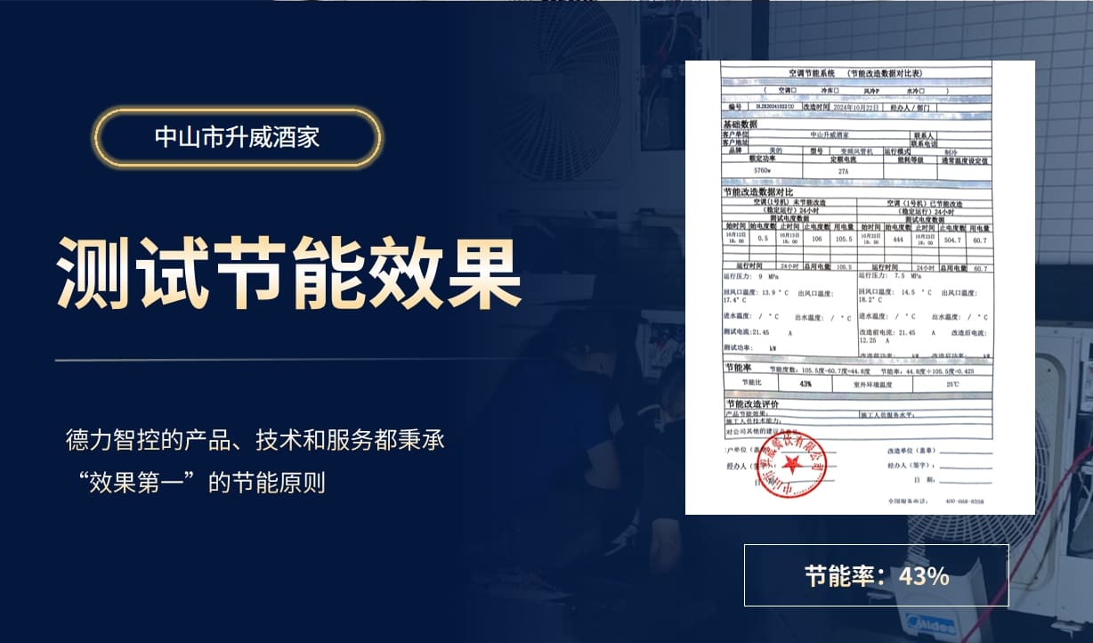 近期,升威酒家選擇了德力智控對酒樓內(nèi)的空調(diào)節(jié)能改造,實地打樣節(jié)能率43%!