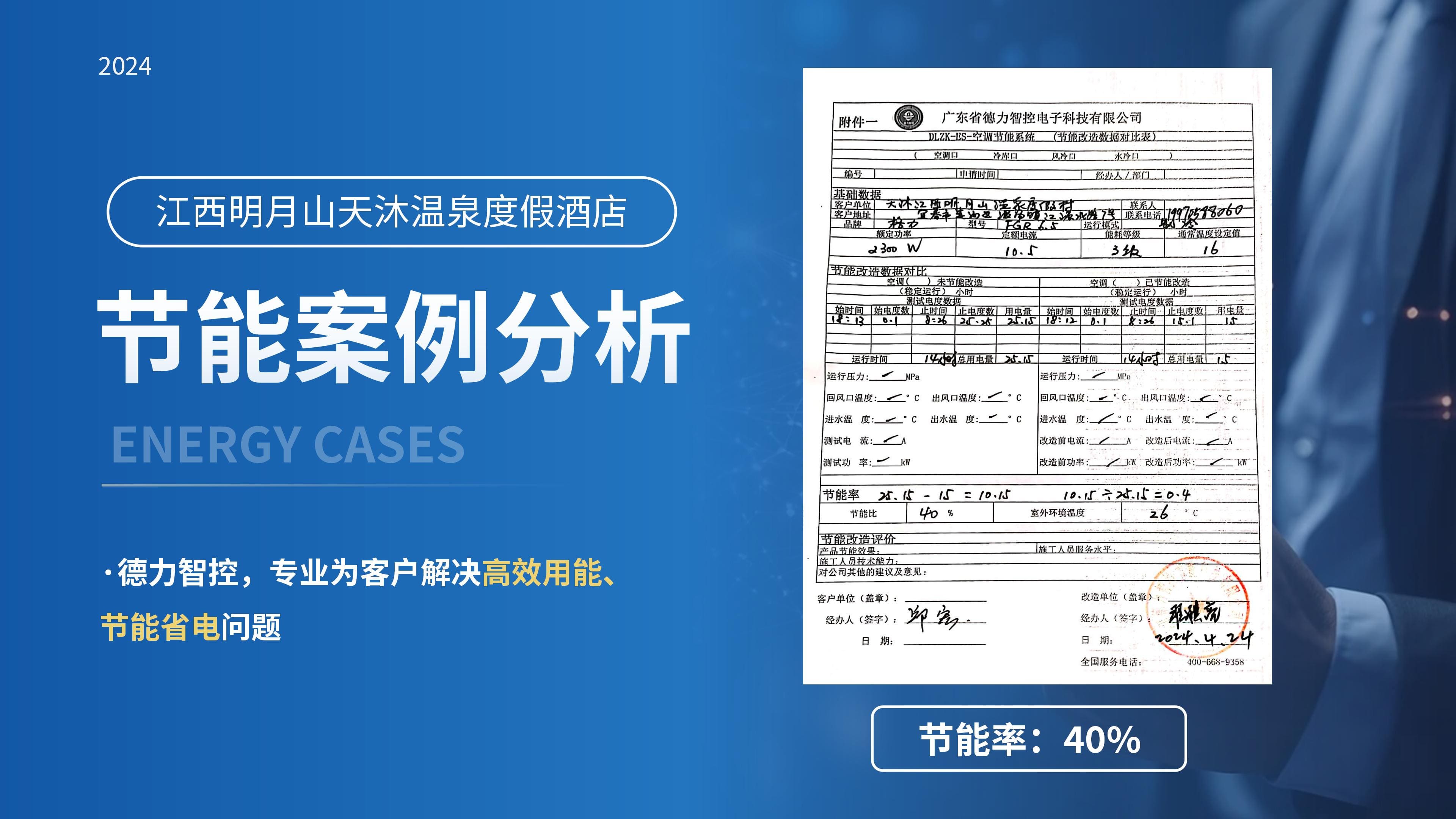 在今年4月,德力智控為江西省明月山天沐溫泉度假酒店節能打樣,節能率40%,不僅為酒店節省了一大筆電費支出,而且改造后的設備依舊高效、穩定運行,制冷體驗感一樣不影響!