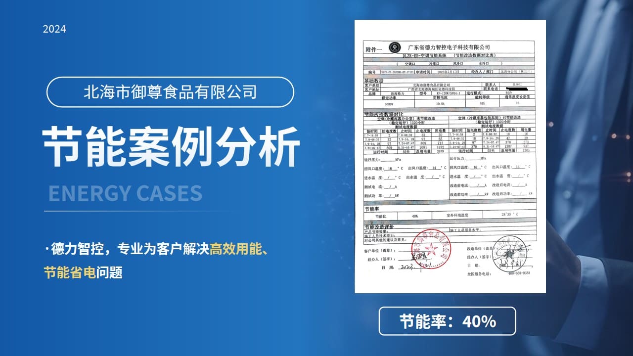 在這一過程中,德力智控注重節能技術的研發與應用,先后服務了無數企事業單位。就以企業為例,德力智控為北海市御尊食品有限公司提供制冷(空調)/制熱系統節能改造服務,節能省電效果很明顯,冷庫節能31%,空調節能40%!