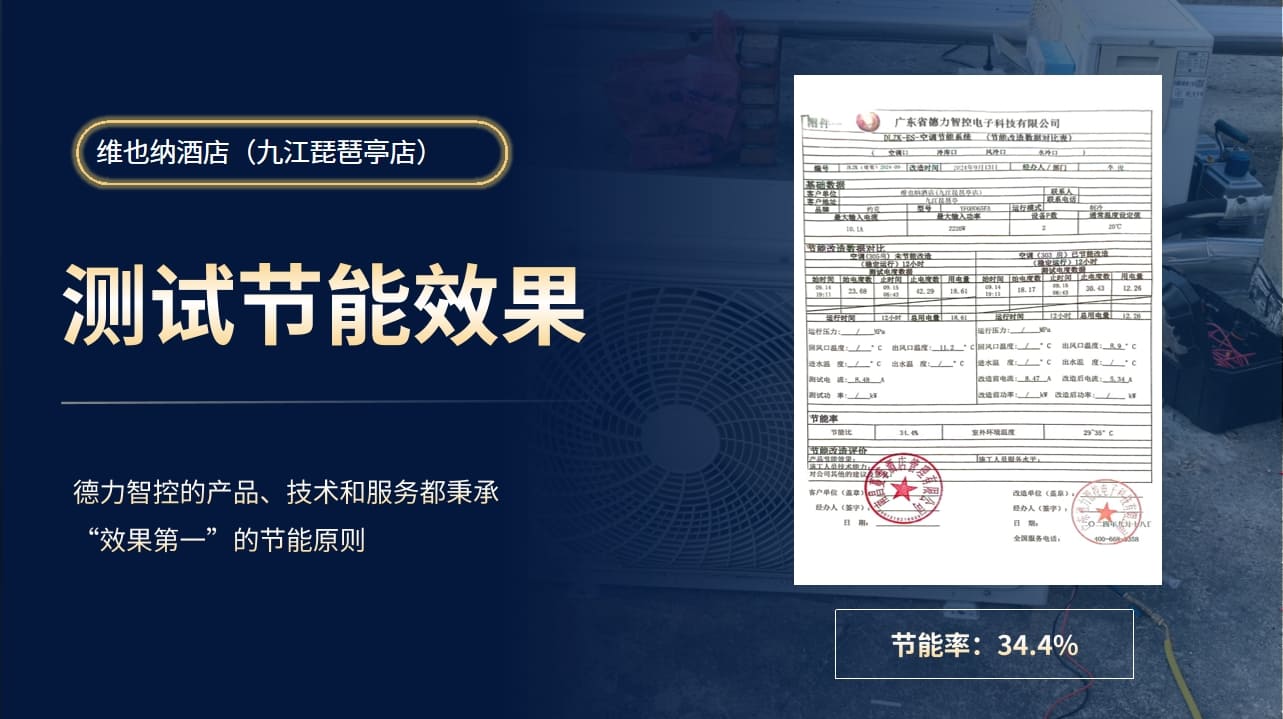 去年9月,德力智控為江西省九江市一維也納酒店的空調(diào)節(jié)能改造,實地打樣節(jié)能率34.4%,不僅不影響酒店正常運營,還真正實現(xiàn)了節(jié)能降耗、省電又省錢。
