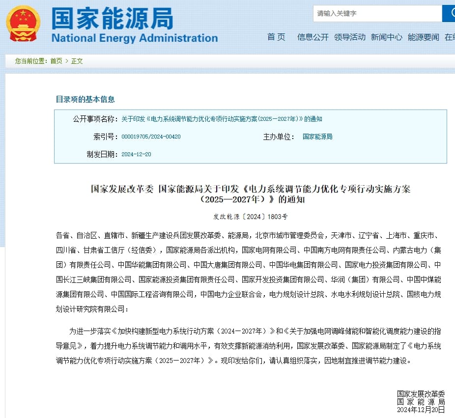 12月20日,國家發(fā)改委、能源局聯(lián)合印發(fā)了《電力系統(tǒng)調(diào)節(jié)能力優(yōu)化專項行動實施方案(2025—2027年)》(以下簡稱:行動實施方案)。