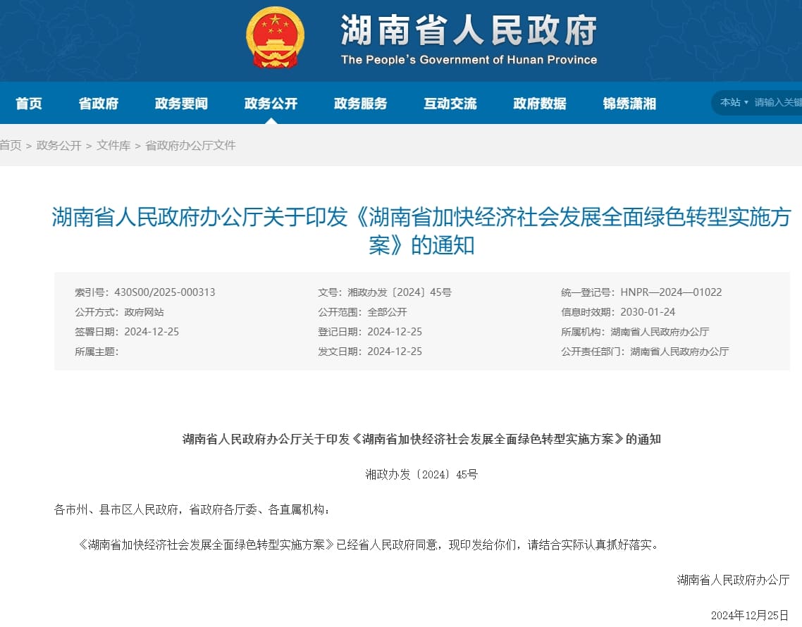 12月25日,湖南省人民政府辦公廳正式印發(fā)了《湖南省加快經(jīng)濟社會發(fā)展全面綠色轉(zhuǎn)型實施方案》(以下簡稱:綠色轉(zhuǎn)型實施方案)。