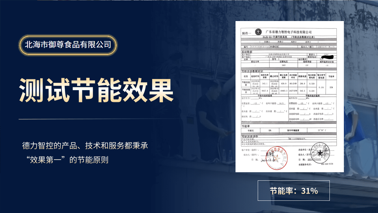 以冷庫為例,德力智控此前為北海市御尊食品有限公司的冷庫節能改造,節能率31%,制冷效果和節能省電有了非常明顯的提升!