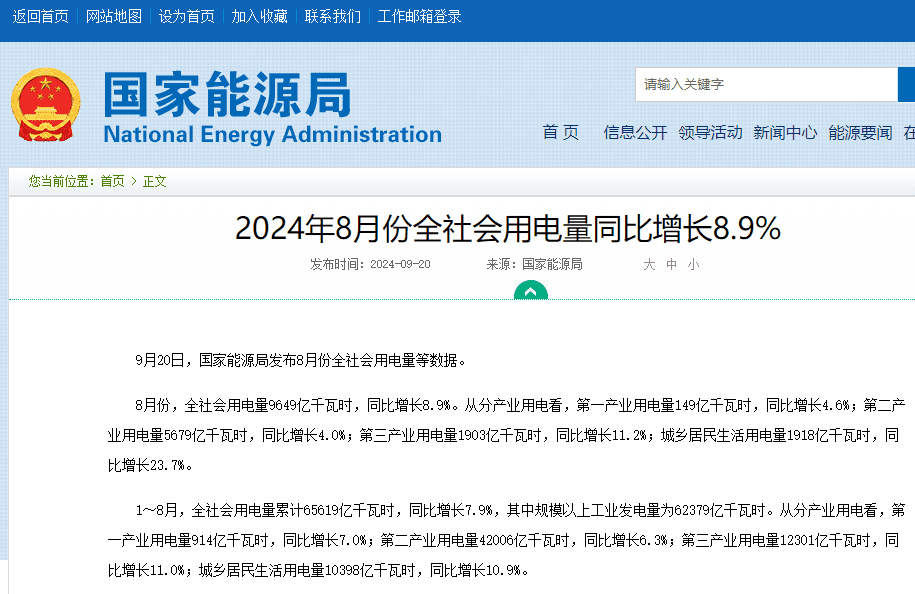 國家能源局20日發布的信息顯示,8月份全社會用電量9649億千瓦時,同比增長8.9%。